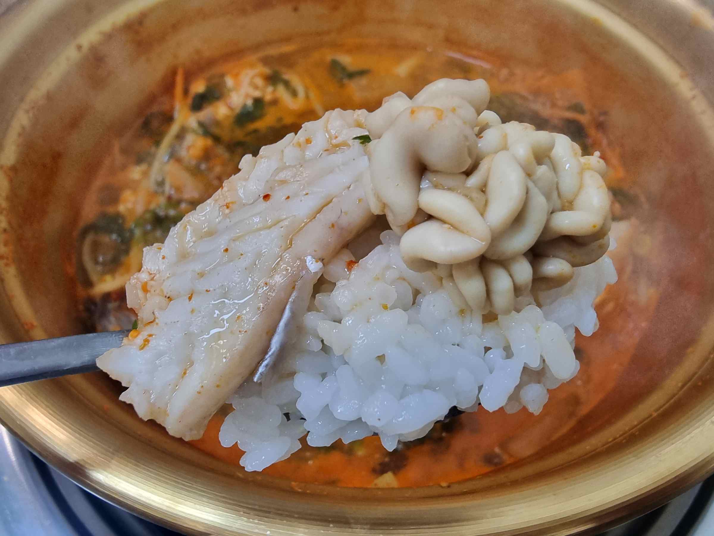 보글보글, 양푼에 섞어탕이 2인분 끓여져 나왔어요. 2인분이라 동태가 한 마리 정도 들어간 것 같았어요. 곤이와 알도 적당히 들어가서 더 맛있었네요.ㅎㅎ